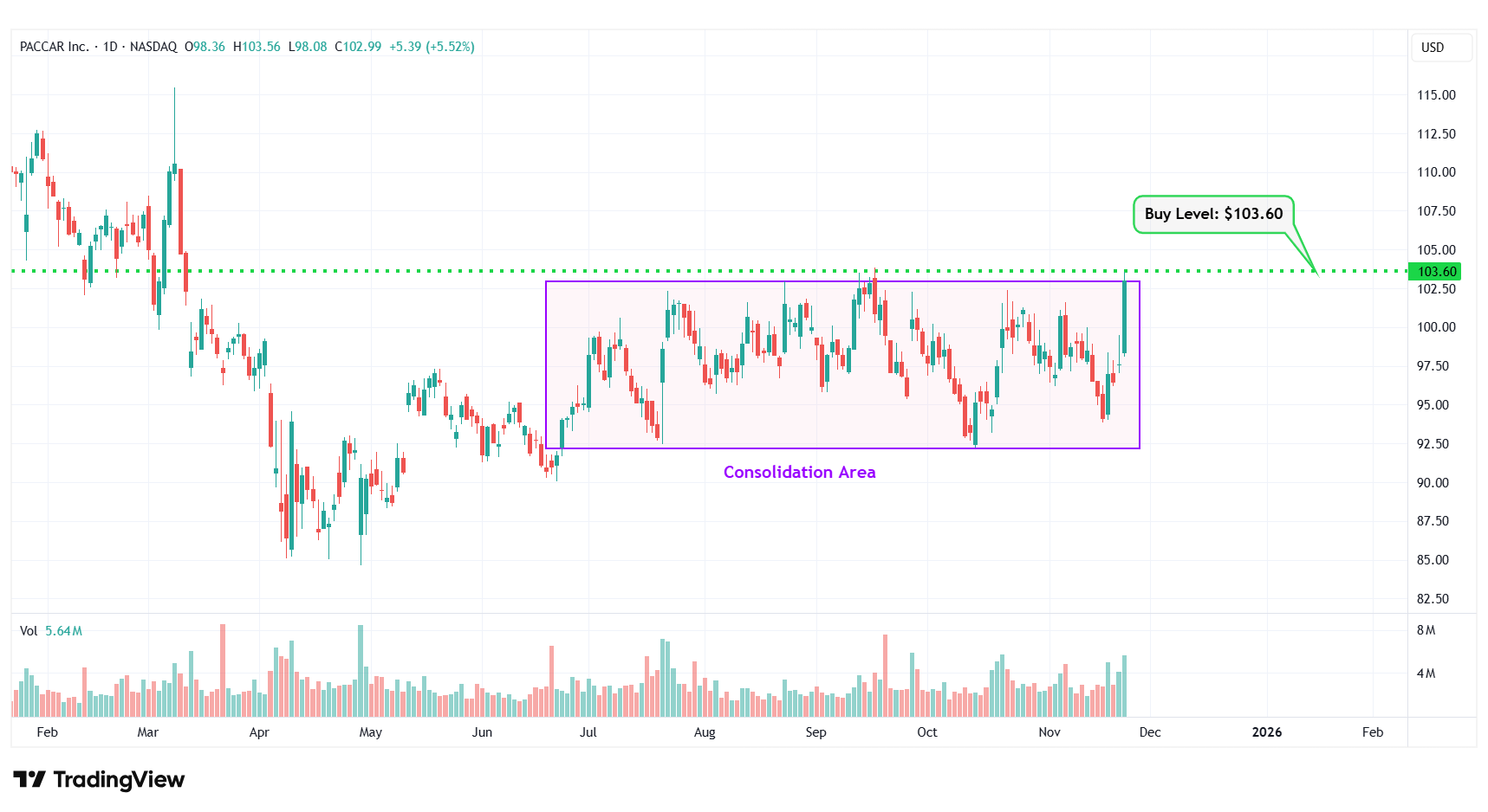 | 5 | Paccar Inc. | NASDAQ: PCAR | $102.99 | $103.60 | Consolidation Area |
