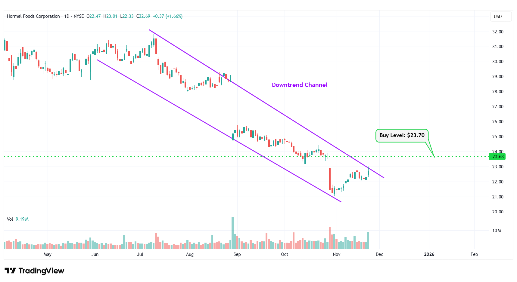 | 6 | Hormel Foods Corp | NYSE: HRL | $22.69 | $23.70 | Downtrend Channel |
