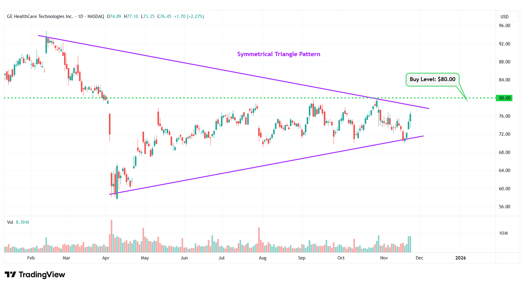 | 7 | GE HealthCare Technologies Inc. | NASDAQ: GEHC | $76.45 | $80.00 | Symmetrical Triangle Pattern |