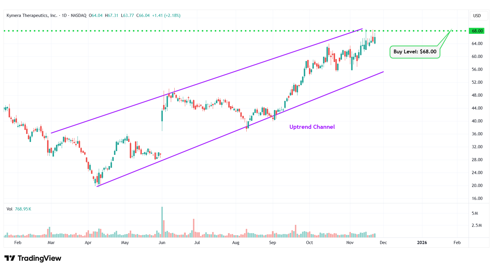 | 8 | Kymera Therapeutics Inc. | NASDAQ: KYMR | $66.04 | $68.00 | Uptrend Channel |