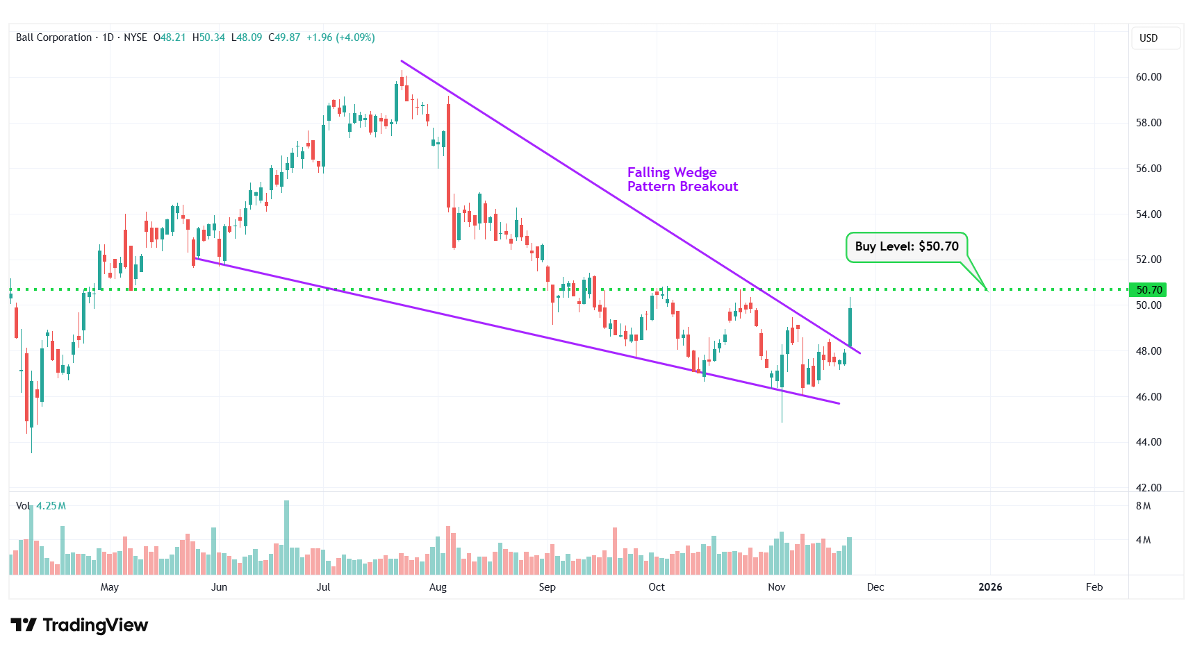 | 9 | Ball Corp | NYSE: BALL | $49.87 | $50.70 | Falling Wedge Pattern Breakout |