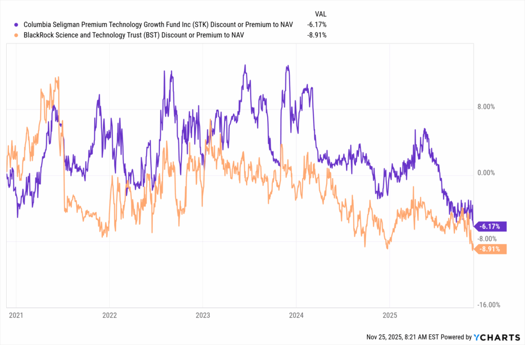 I should note before we go further, though, that the two CEFs we’ll get into below—the BlackRock Science and Technology Trust (BST) and the Columbia Seligman Premium Technology Growth Fund (STK)—have much lower fees: about 1.1% each.