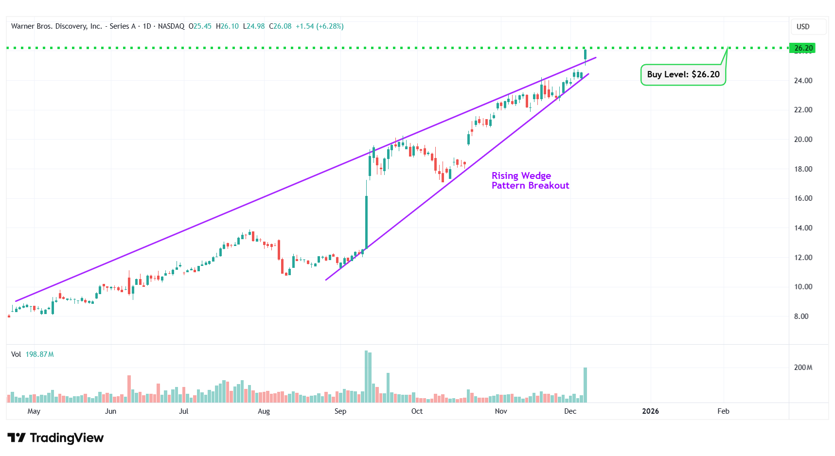 | 10 | Warner Bros. Discovery Inc. | NASDAQ: WBD | $26.08 | $26.20 | Rising Wedge Pattern Breakout |
