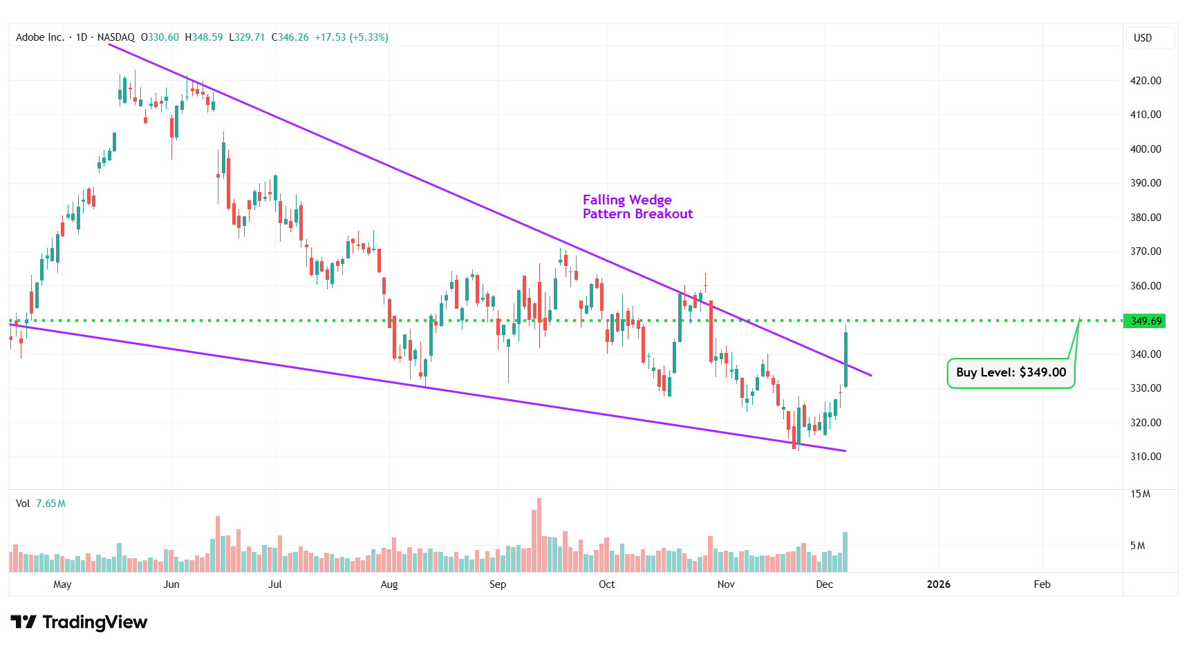 | 1 | Adobe Inc. | NASDAQ: ADBE | $346.26 | $349.00 | Falling Wedge Pattern Breakout |
