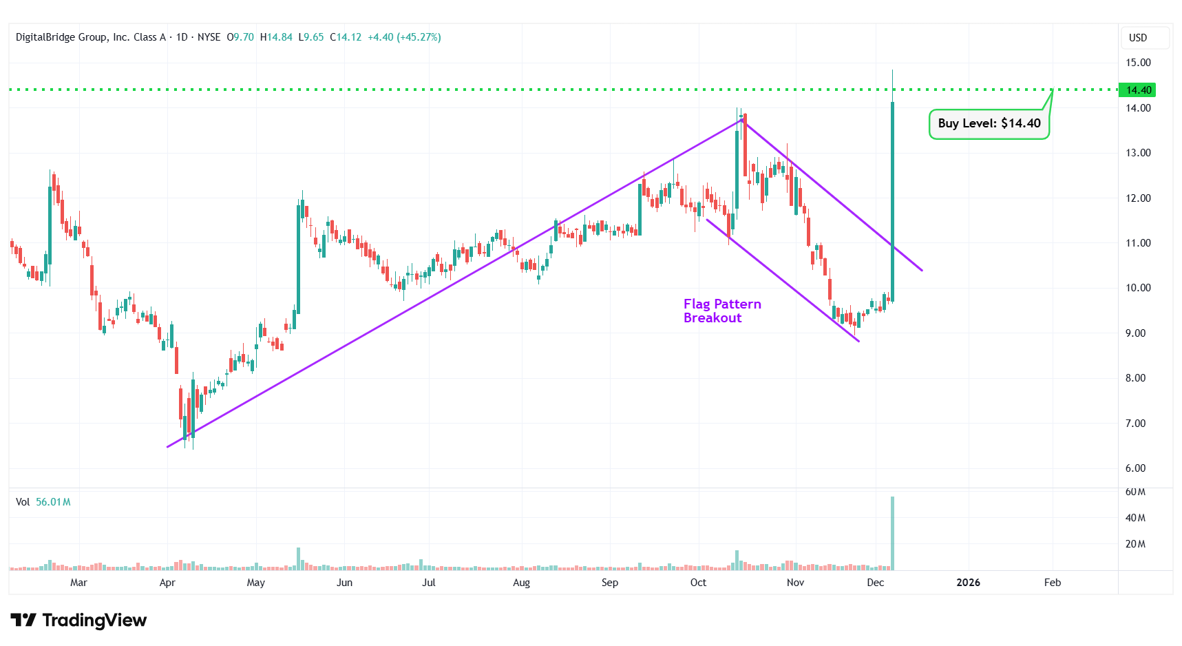 | 2 | DigitalBridge Group Inc. | NYSE: DBRG | $14.12 | $14.40 | Flag Pattern Breakout |
