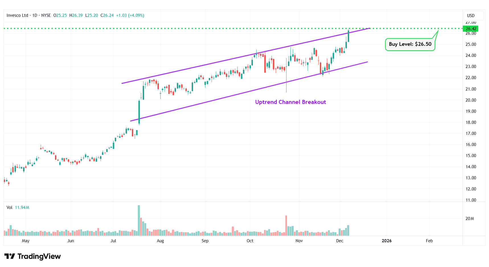 | 3 | Invesco Ltd. | NYSE: IVZ | $26.24 | $26.50 | Uptrend Channel Breakout |