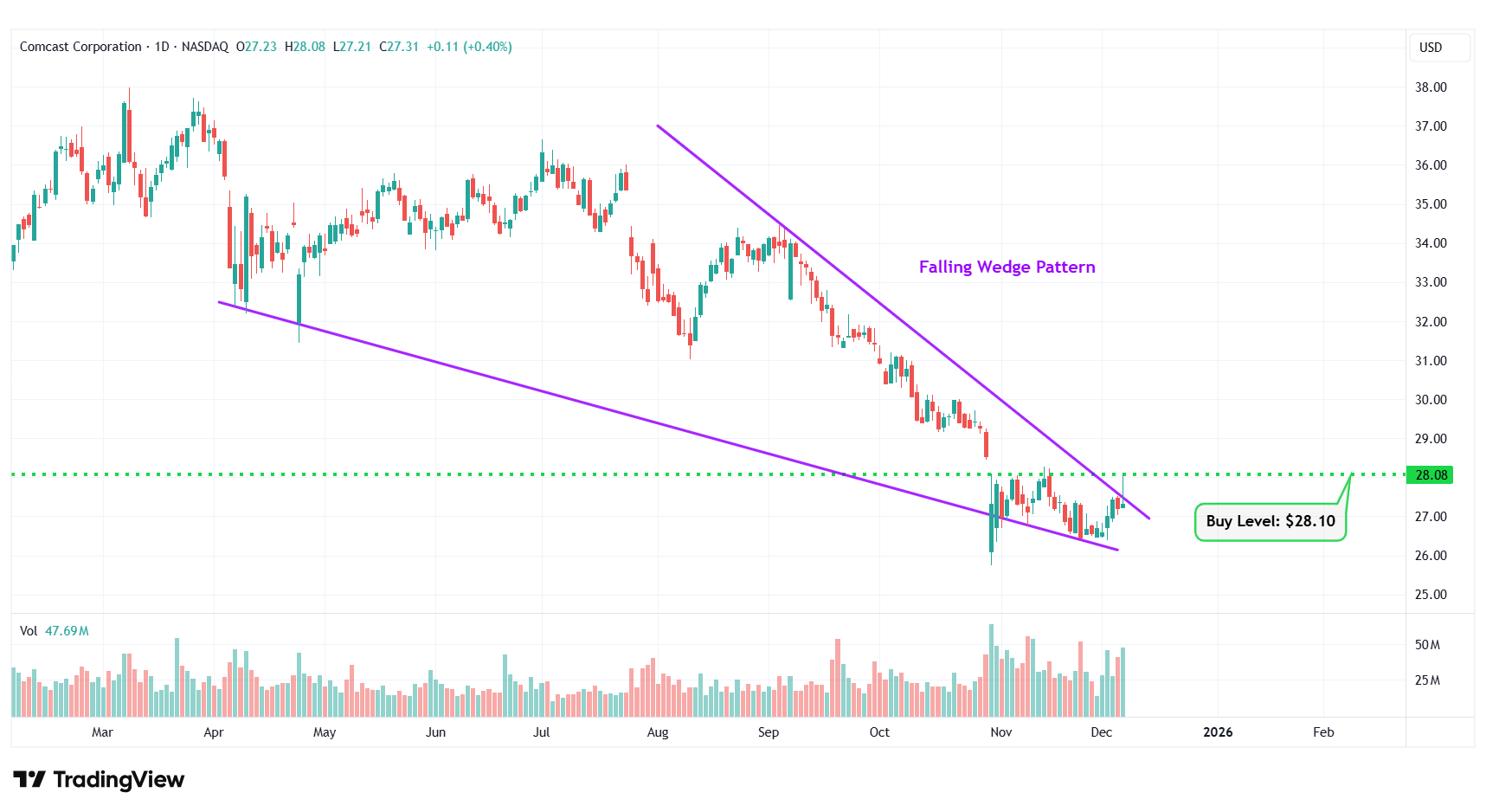 | 4 | Comcast Corp. | NASDAQ: CMCSA | $27.31 | $28.10 | Falling Wedge Pattern |