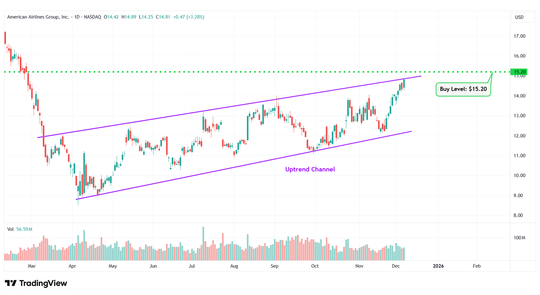 | 5 | American Airlines Group Inc. | NASDAQ: AAL | $14.81 | $15.20 | Uptrend Channel |