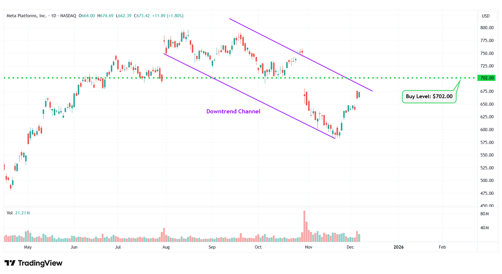 | 6 | Meta Platforms Inc. | NASDAQ: META | $673.42 | $702.00 | Downtrend Channel |