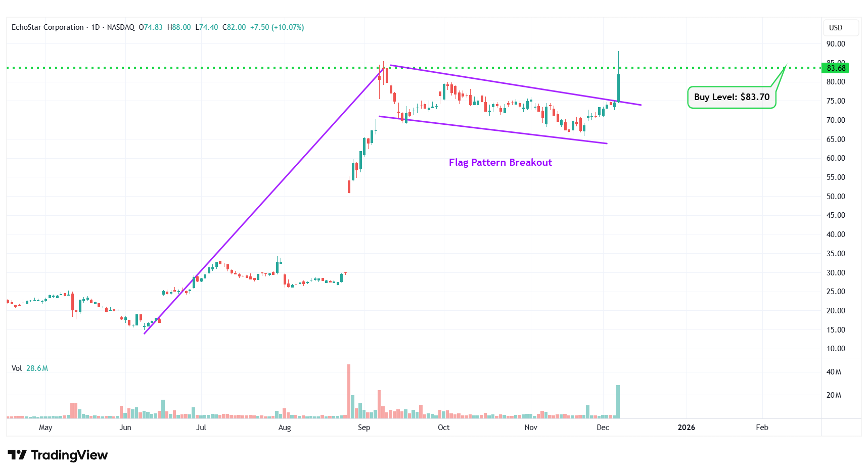 | 7 | EchoStar Corp. | NASDAQ: SATS | $82.00 | $83.70 | Flag Pattern Breakout |