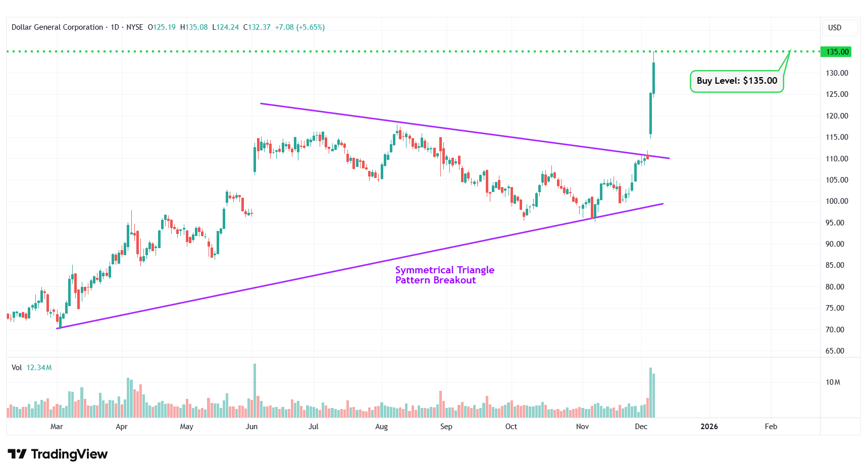 | 8 | Dollar General Corp. | NYSE: DG | $132.37 | $135.00 | Symmetrical Triangle Pattern Breakout |