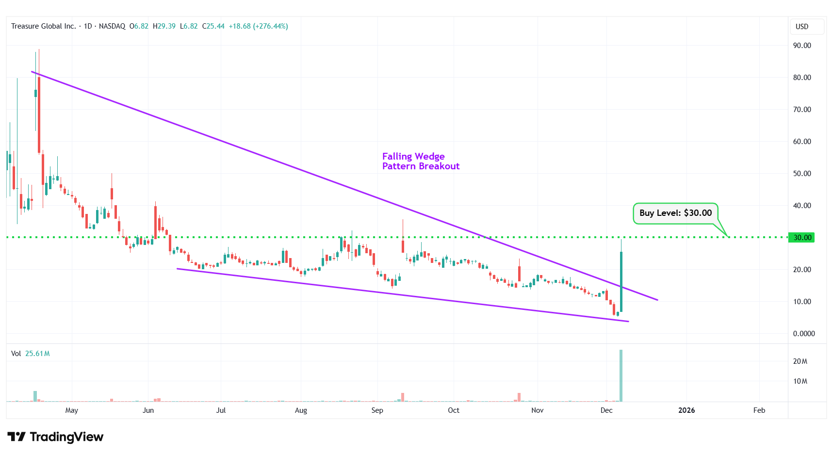 | 9 | Treasure Global Inc. | NASDAQ: TGL | $25.44 | $30.00 | Falling Wedge Pattern Breakout |