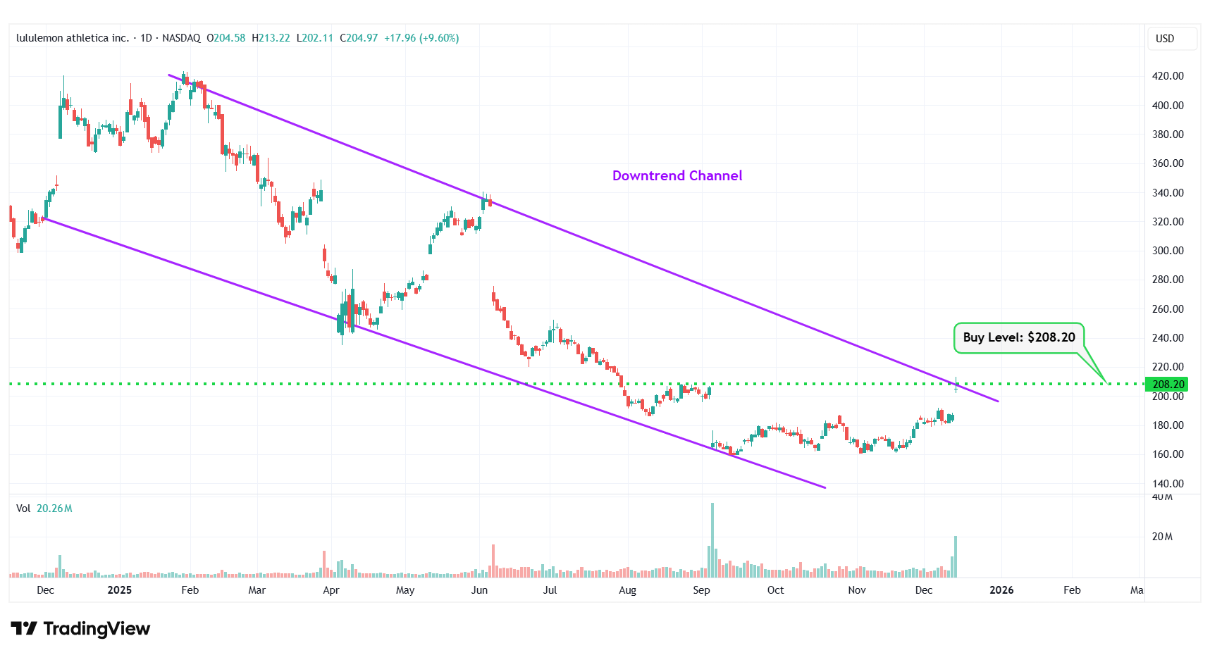 | 10 | Lululemon Athletica Inc. | NASDAQ: LULU | $204.97 | $208.20 | Downtrend Channel |