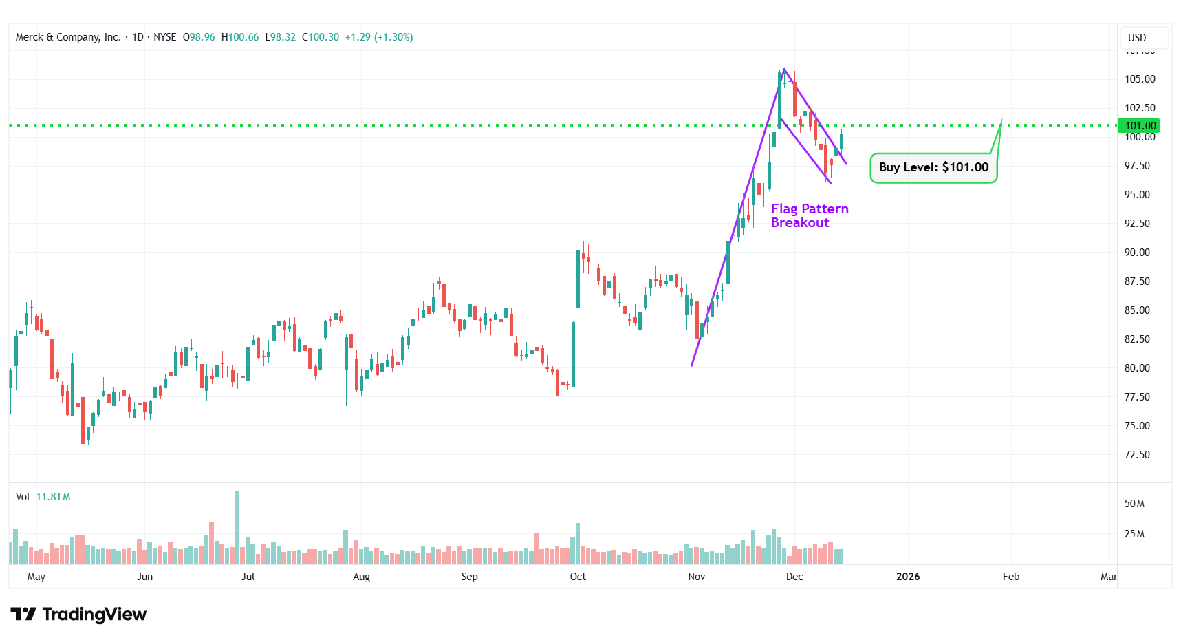 | 1 | Merck & Co Inc. | NYSE: MRK | $100.30 | $101.00 | Flag Pattern Breakout |