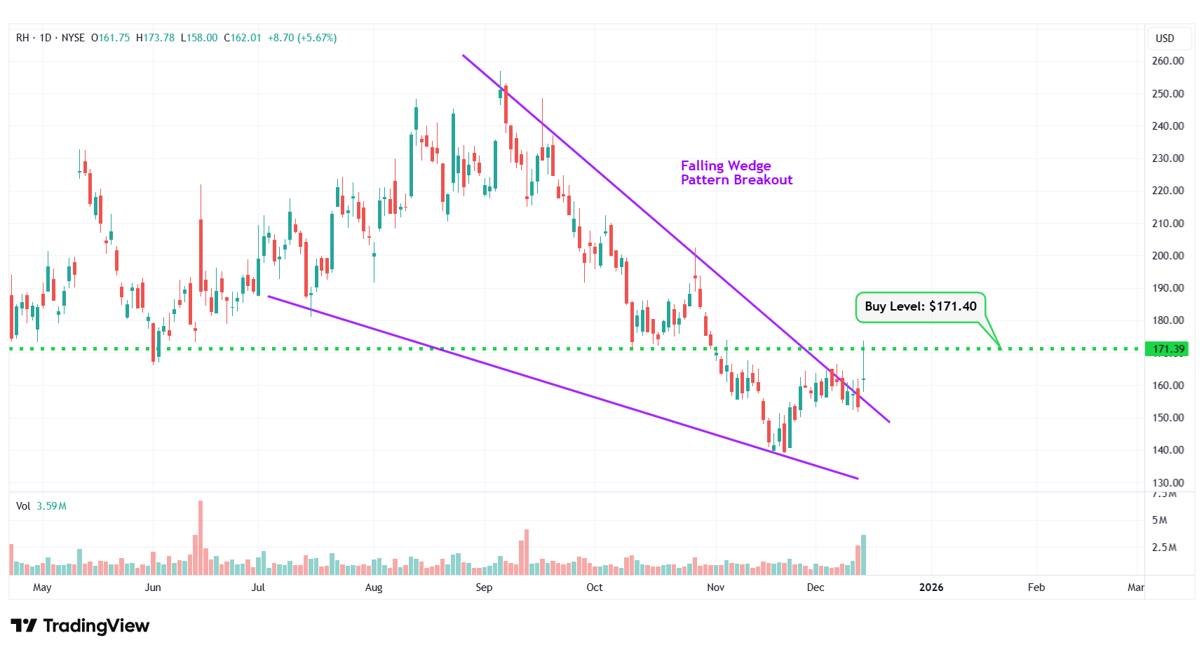 | 2 | RH | NYSE: RH | $162.01 | $171.40 | Falling Wedge Pattern Breakout |