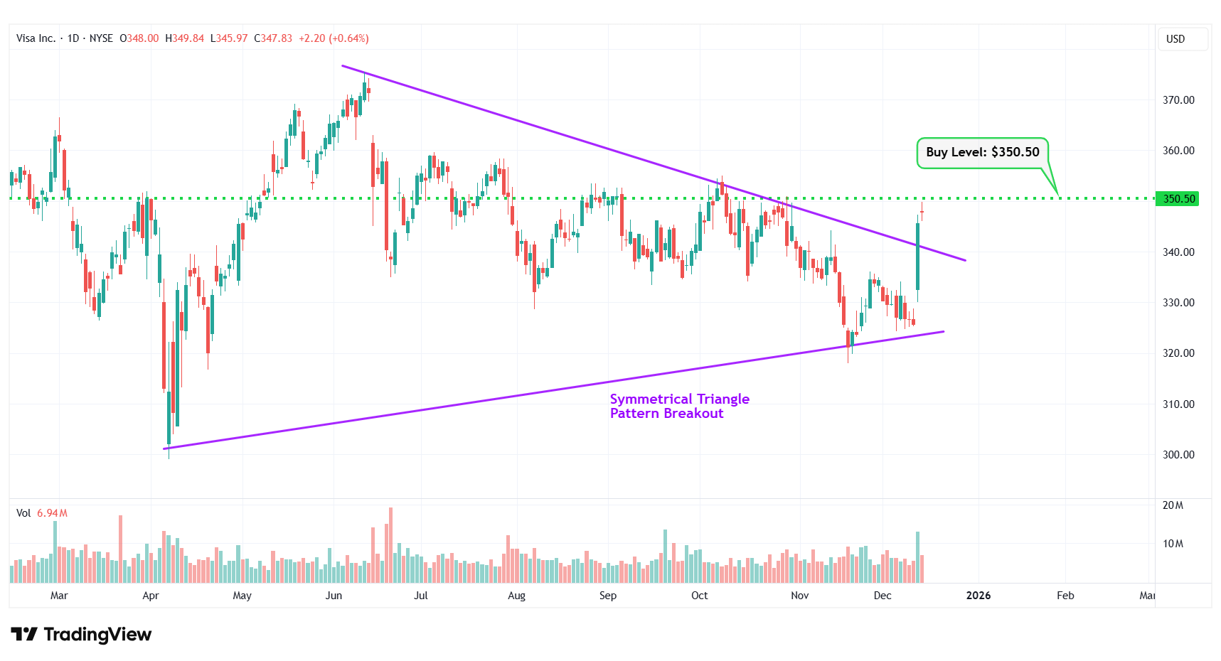 | 3 | Visa Inc. | NYSE: V | $347.83 | $350.50 | Symmetrical Triangle Pattern Breakout |