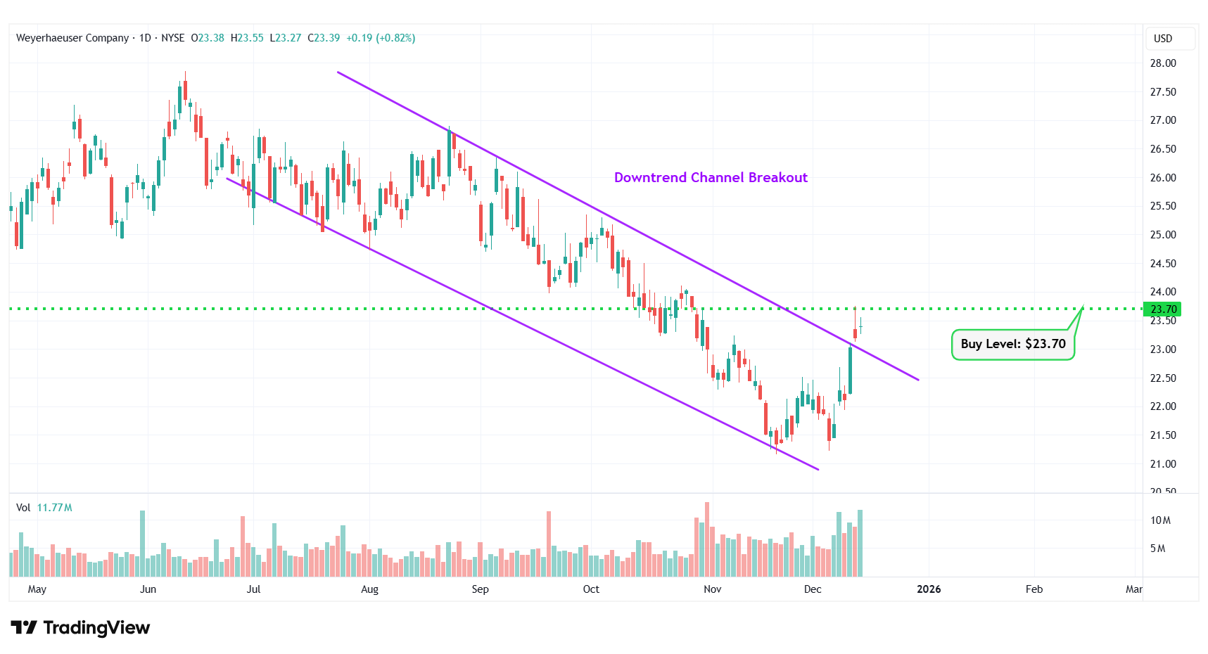 | 4 | Weyerhaeuser Co. | NYSE: WY | $23.39 | $23.70 | Downtrend Channel Breakout |
