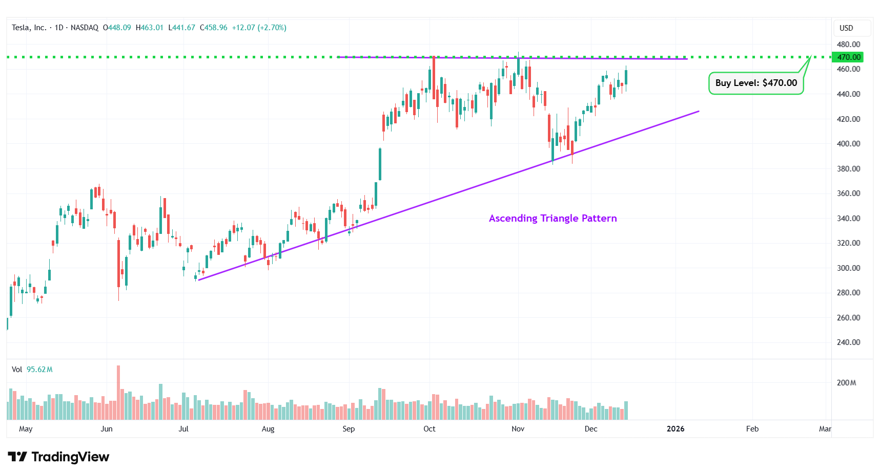 | 5 | Tesla Inc. | NASDAQ: TSLA | $458.96 | $470.00 | Ascending Triangle Pattern |