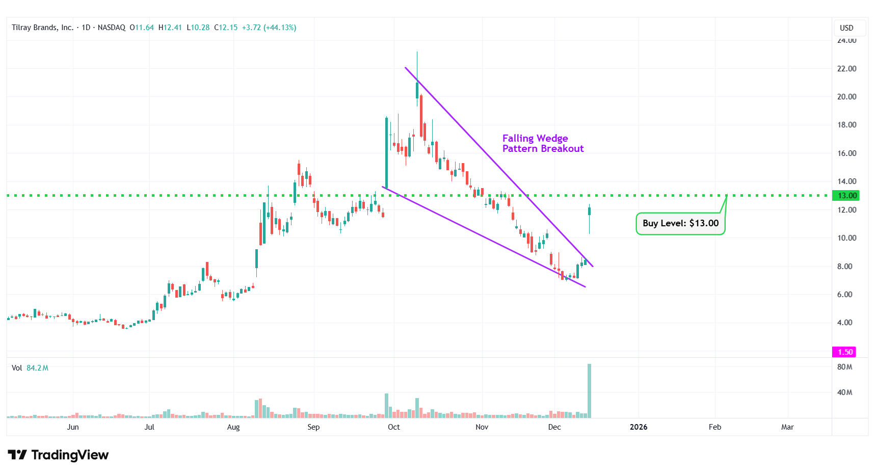 | 6 | Tilray Brands Inc. | NASDAQ: TLRY | $12.15 | $13.00 | Falling Wedge Pattern Breakout |