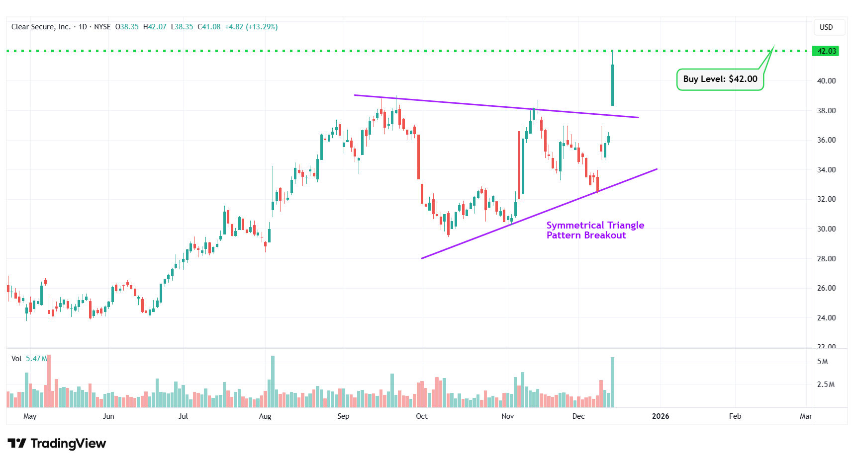 | 7 | Clear Secure Inc. | NYSE: YOU | $41.08 | $42.00 | Symmetrical Triangle Pattern Breakout |