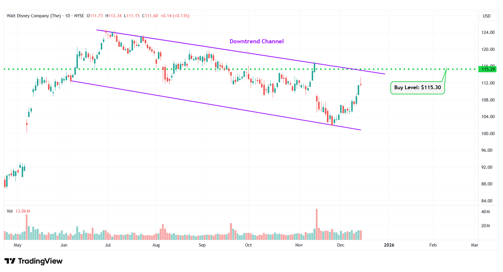| 8 | Walt Disney Co. | NYSE: DIS | $111.60 | $115.30 | Downtrend Channel |