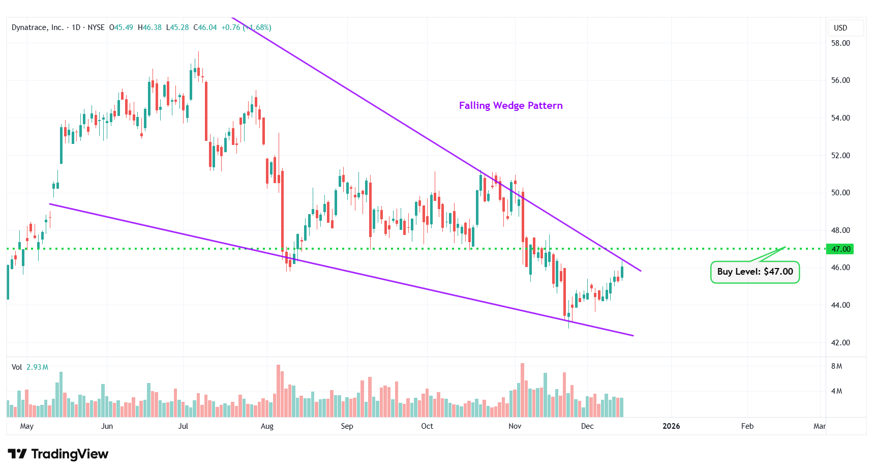| 9 | Dynatrace Inc. | NYSE: DT | $46.04 | $47.00 | Falling Wedge Pattern |