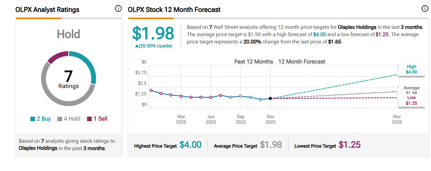 Analyst Consensus: As per TipRanks Analytics, based on 7 Wall Street analysts offering 12-month price targets for OLPX in the last 3 months, the stock has an average price target of $1.98, which is nearly 20% upside from current levels.