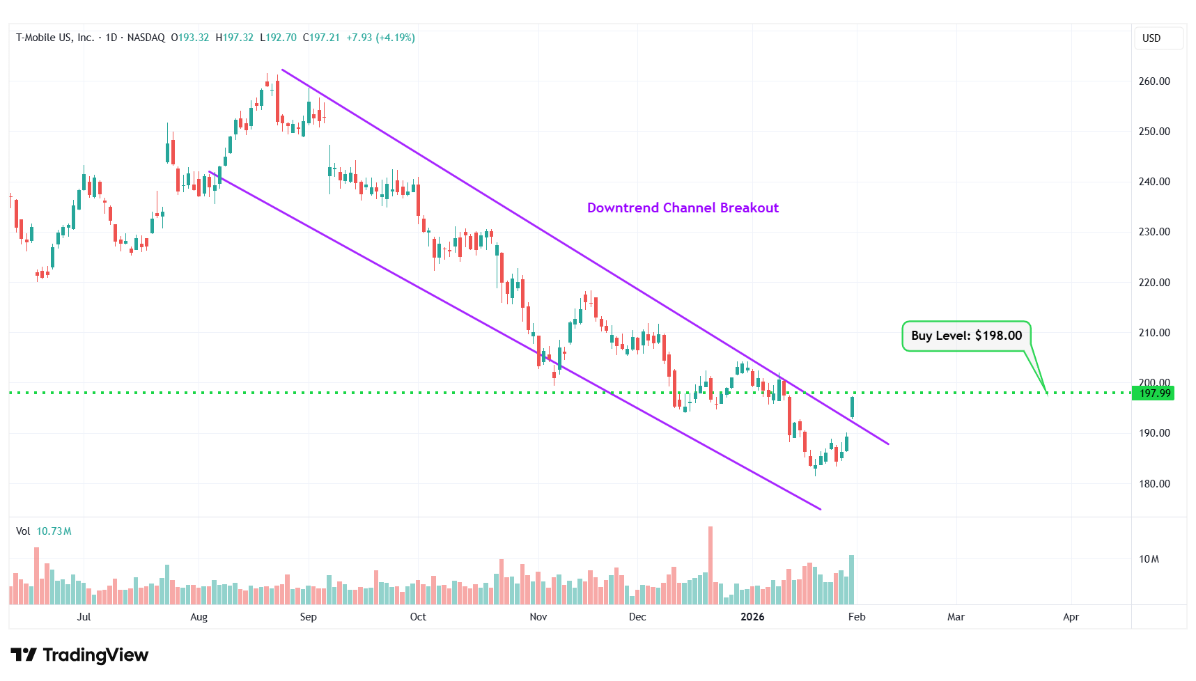 | 10 | T-Mobile US Inc. | NASDAQ: TMUS | $197.21 | $198.00 | Downtrend Channel Breakout |