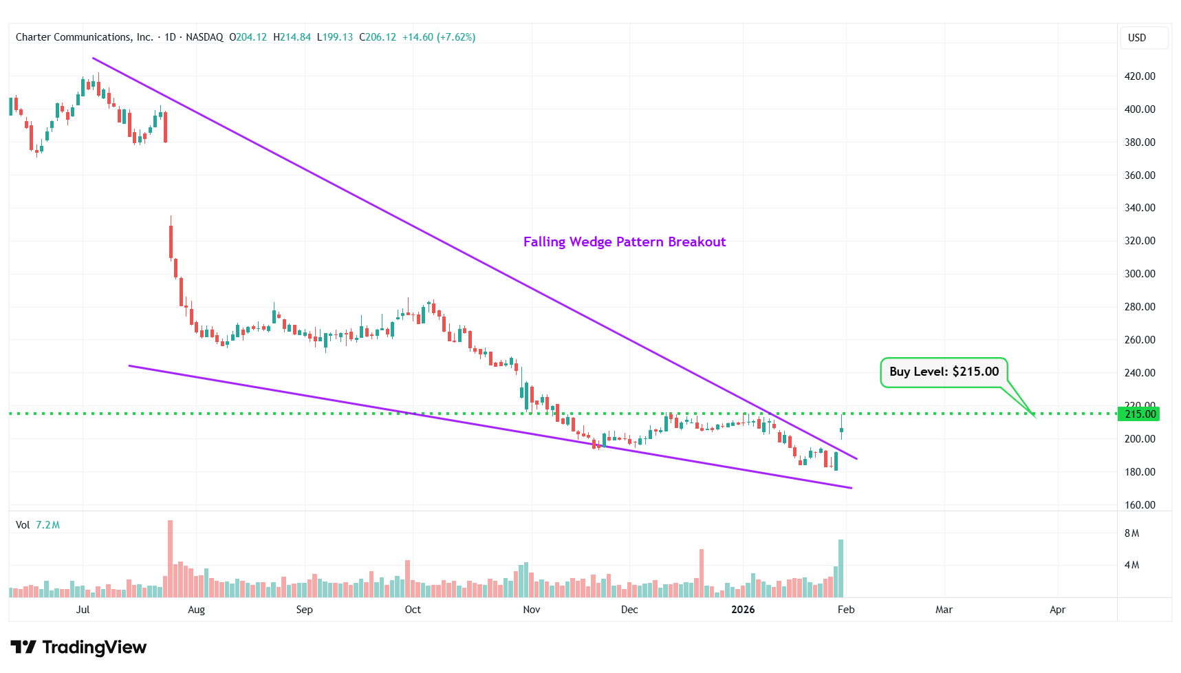 | 1 | Charter Communications Inc. | NASDAQ: CHTR | $206.12 | $215.00 | Falling Wedge Pattern Breakout |