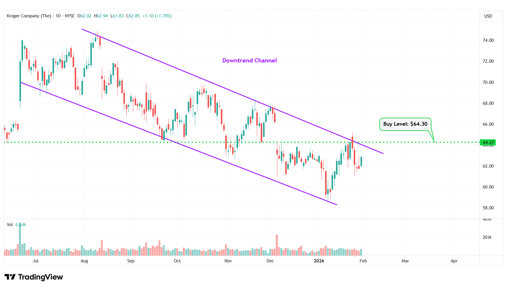 | 3 | Kroger Co. | NYSE: KR | $62.85 | $64.30 | Downtrend Channel |