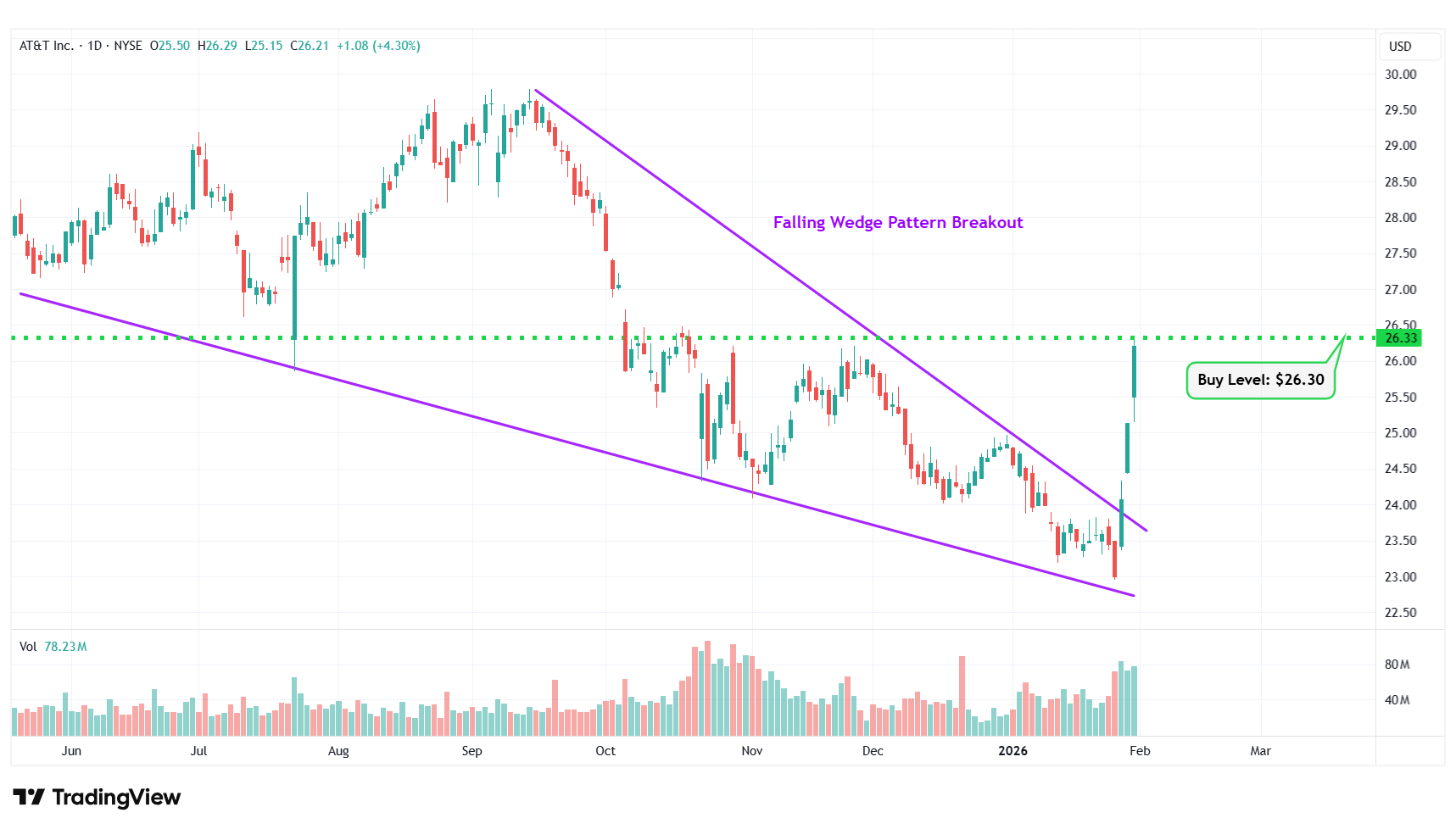 | 5 | AT&T, Inc. | NYSE: T | $26.21 | $26.30 | Falling Wedge Pattern Breakout |