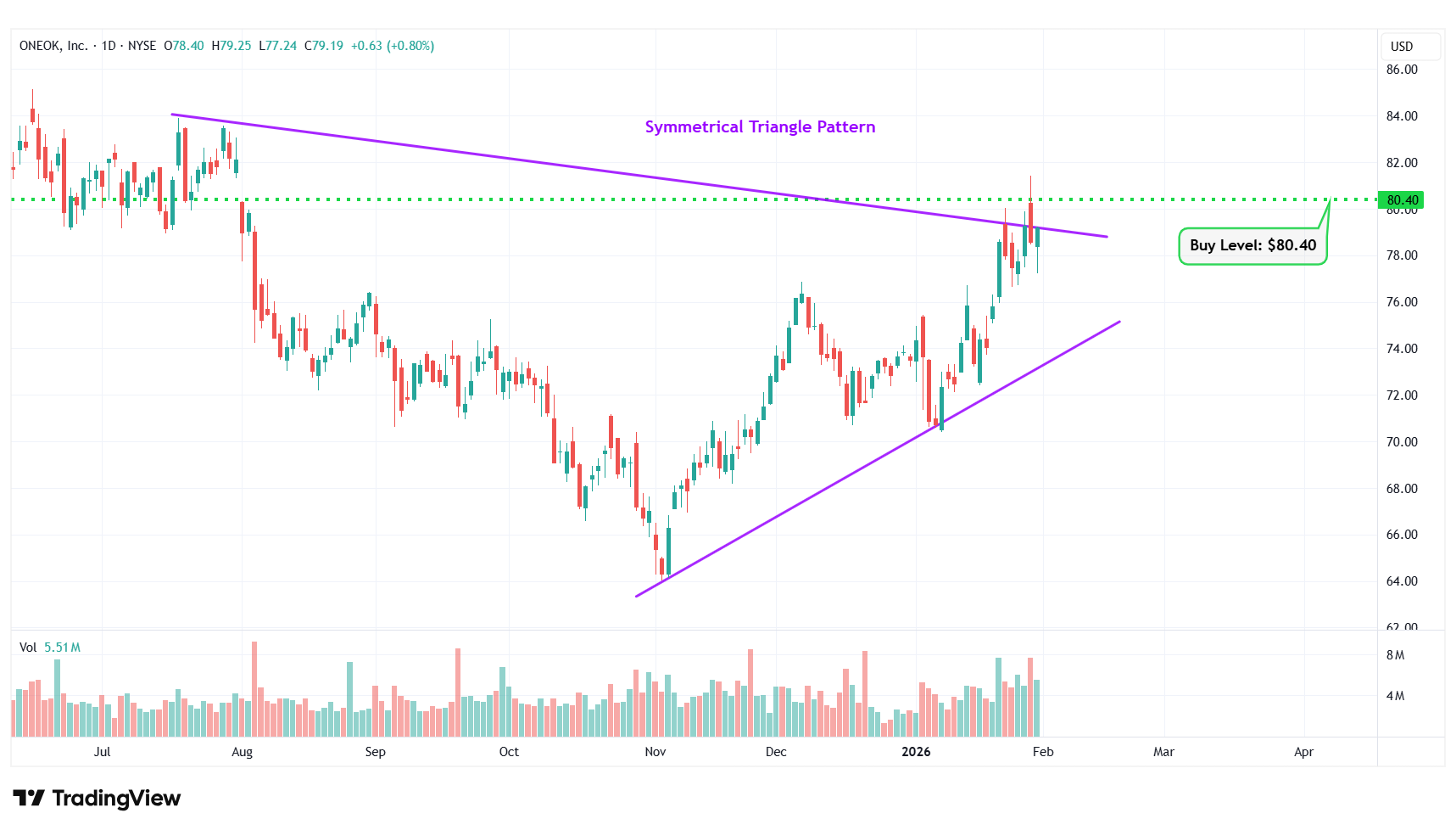 | 6 | Oneok Inc. | NYSE: OKE | $79.19 | $80.40 | Symmetrical Triangle Pattern |