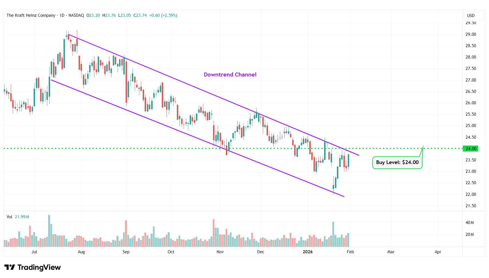 | 7 | Kraft Heinz Co. | NASDAQ: KHC | $23.74 | $24.00 | Downtrend Channel |