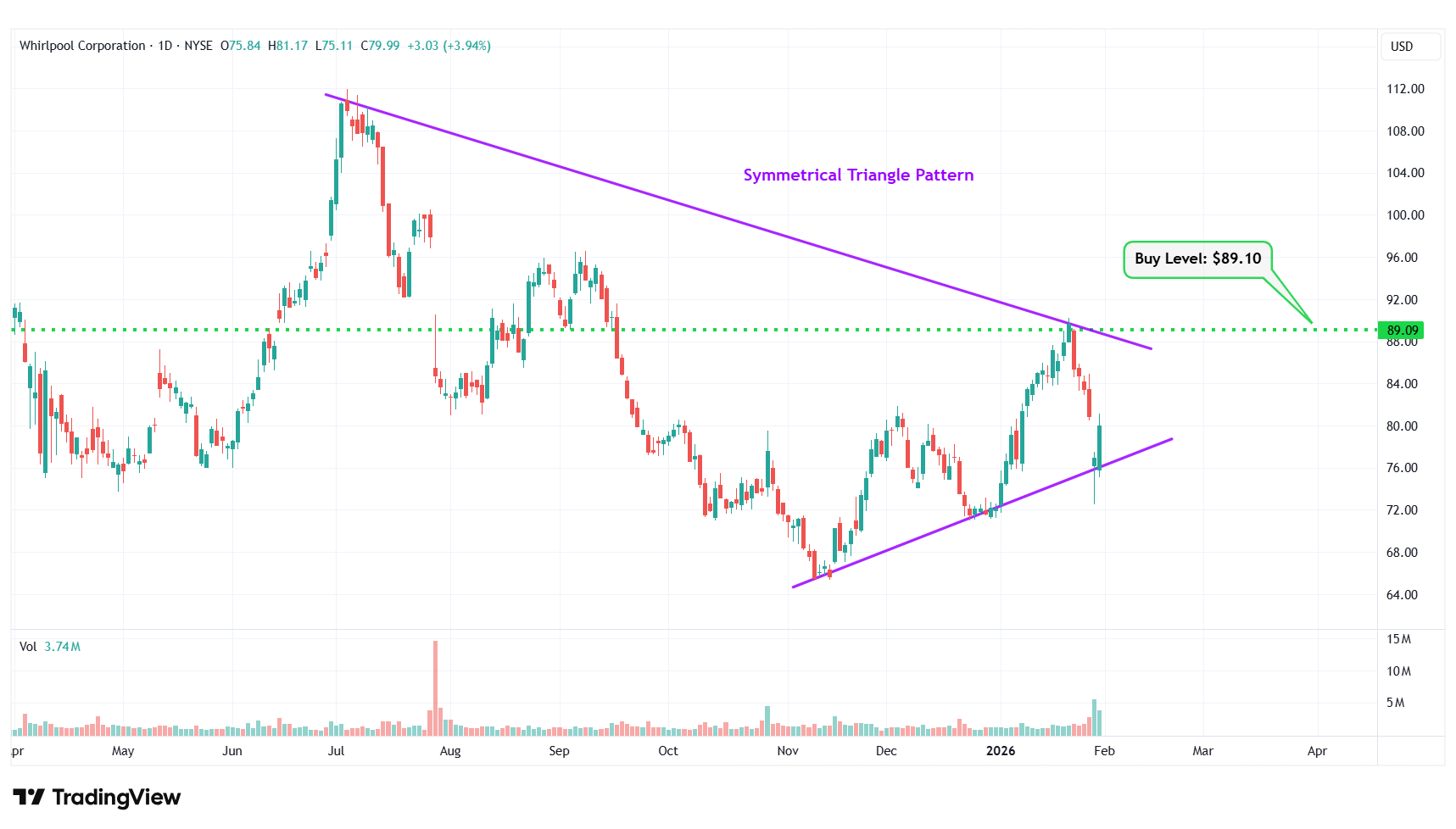 | 8 | Whirlpool Corp | NYSE: WHR | $79.99 | $89.10 | Symmetrical Triangle Pattern |