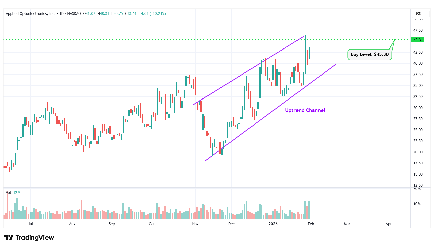 | 9 | Applied Optoelectronics Inc. | NASDAQ: AAOI | $43.61 | $45.30 | Uptrend Channel |