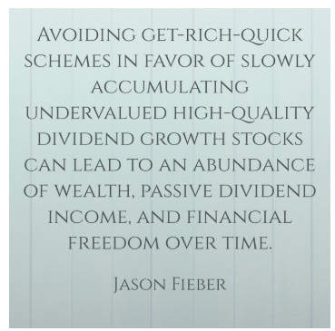 Avoiding get-rich-quick schemes (which will instead almost certainly result in becoming poor) in favor of slowly accumulating undervalued high-quality dividend growth stocks can lead to an abundance of wealth, passive dividend income, and financial freedom over time.