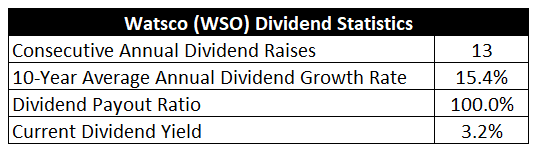 To date, Watsco has increased its dividend for 13 consecutive years.