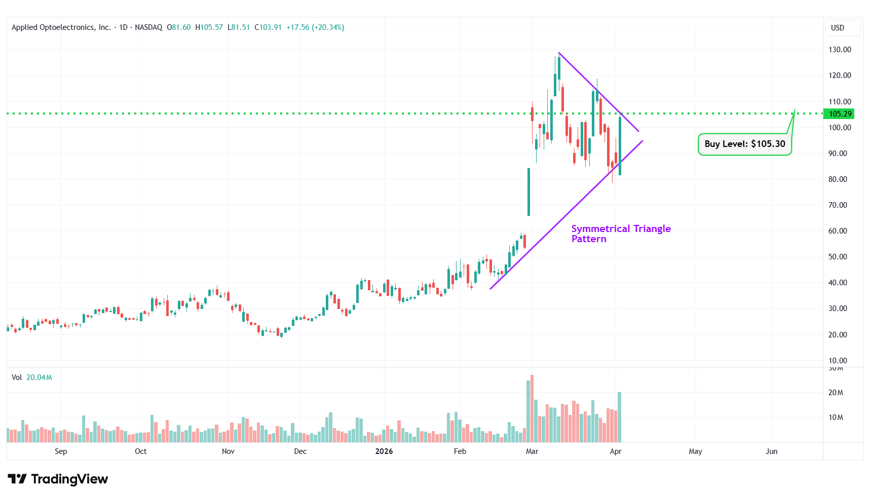 Buy Level(s): The ideal buy level for AAOI is if the stock has a daily close above the breakout level of the symmetrical triangle pattern, at around $105.30. This is marked in the chart below as a green color dotted line.