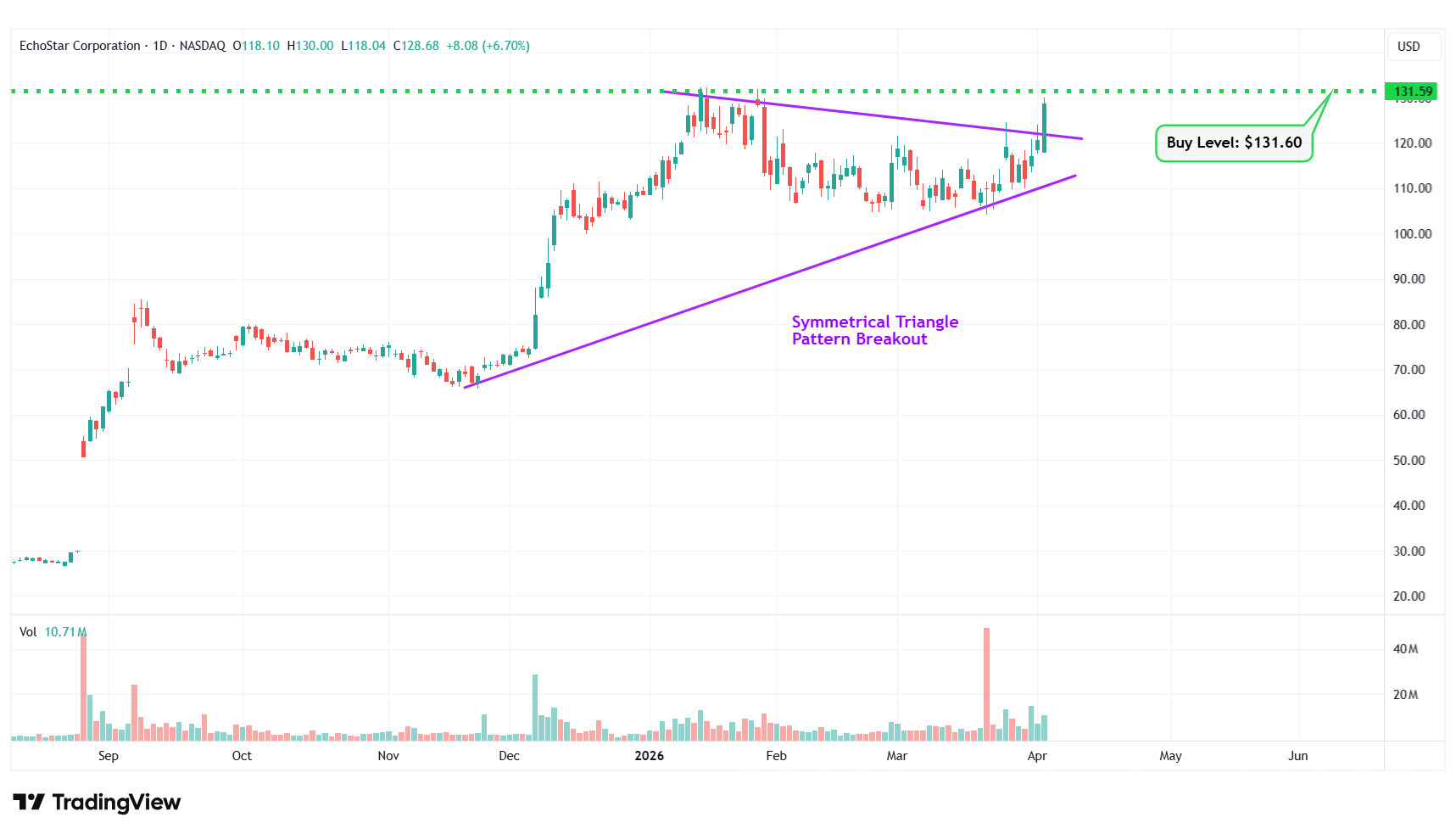 Buy Level(s): The stock has currently broken out of a symmetrical triangle pattern. However, the ideal buy level for SATS is if the stock closes above the immediate resistance level of $131.60. This is marked in the chart below as a green color dotted line.