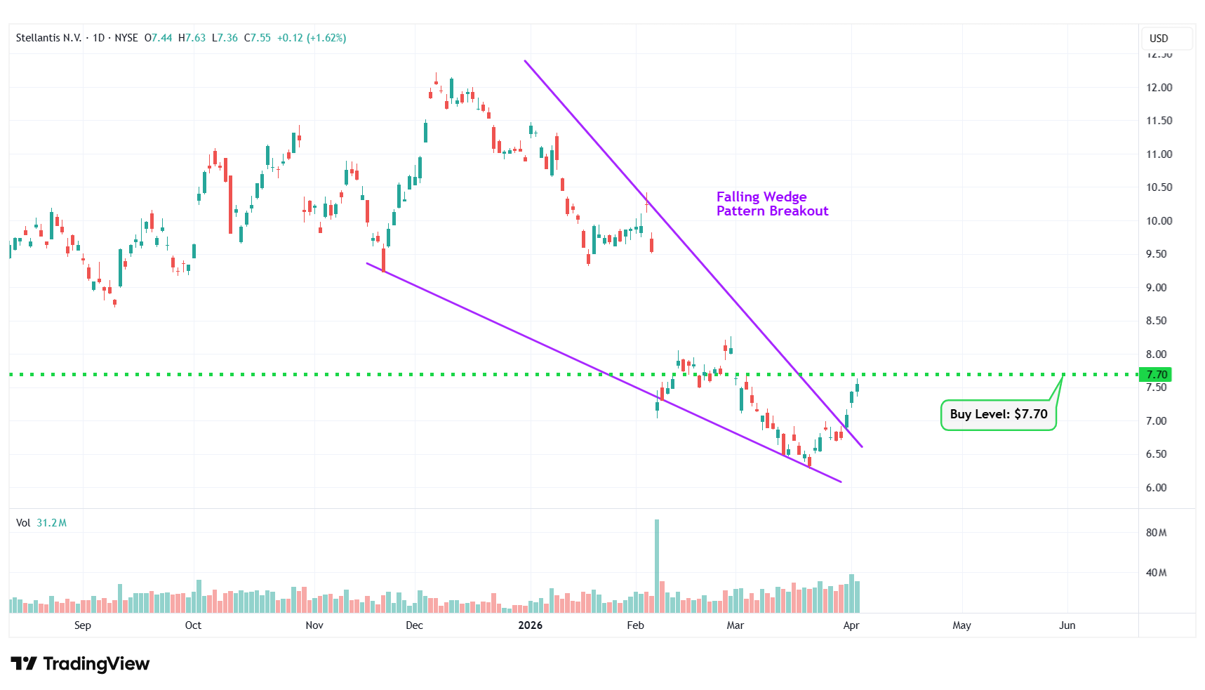 Buy Level(s): The stock has currently broken out of a falling wedge pattern. However, the ideal buy level for STLA is above the nearest resistance level of $7.70. This is marked in the chart below as a green color dotted line.