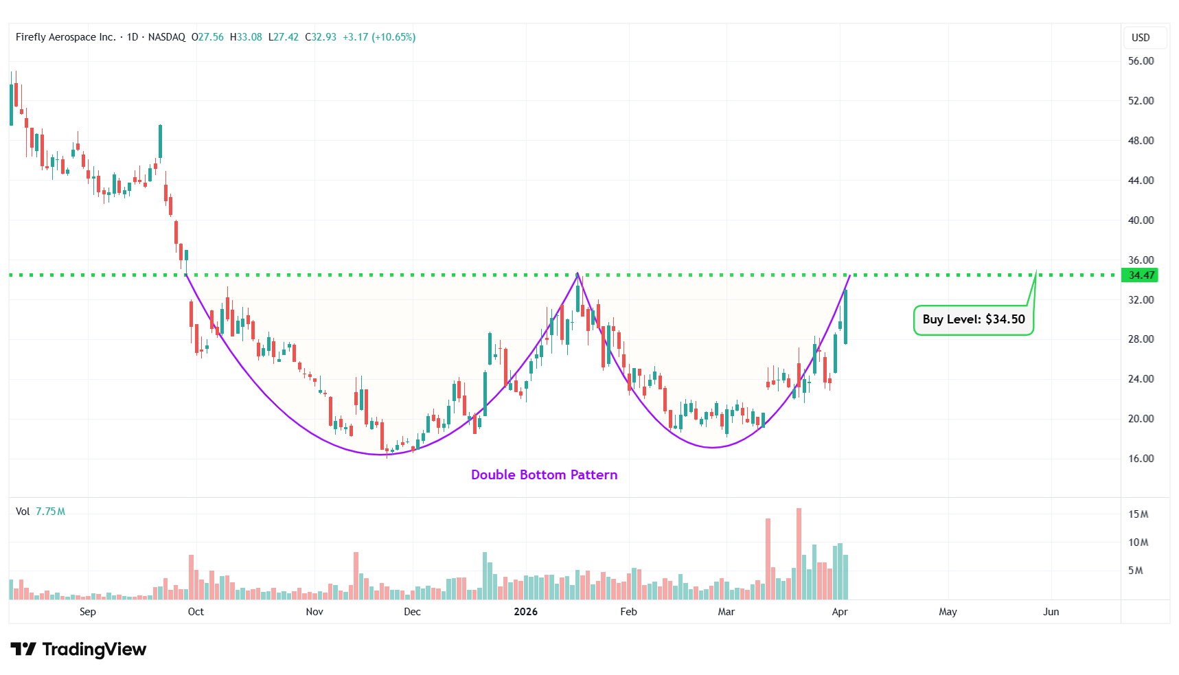 3 Firefly Aerospace Inc. NASDAQ: FLY $32.93 $34.50 Double Bottom Pattern