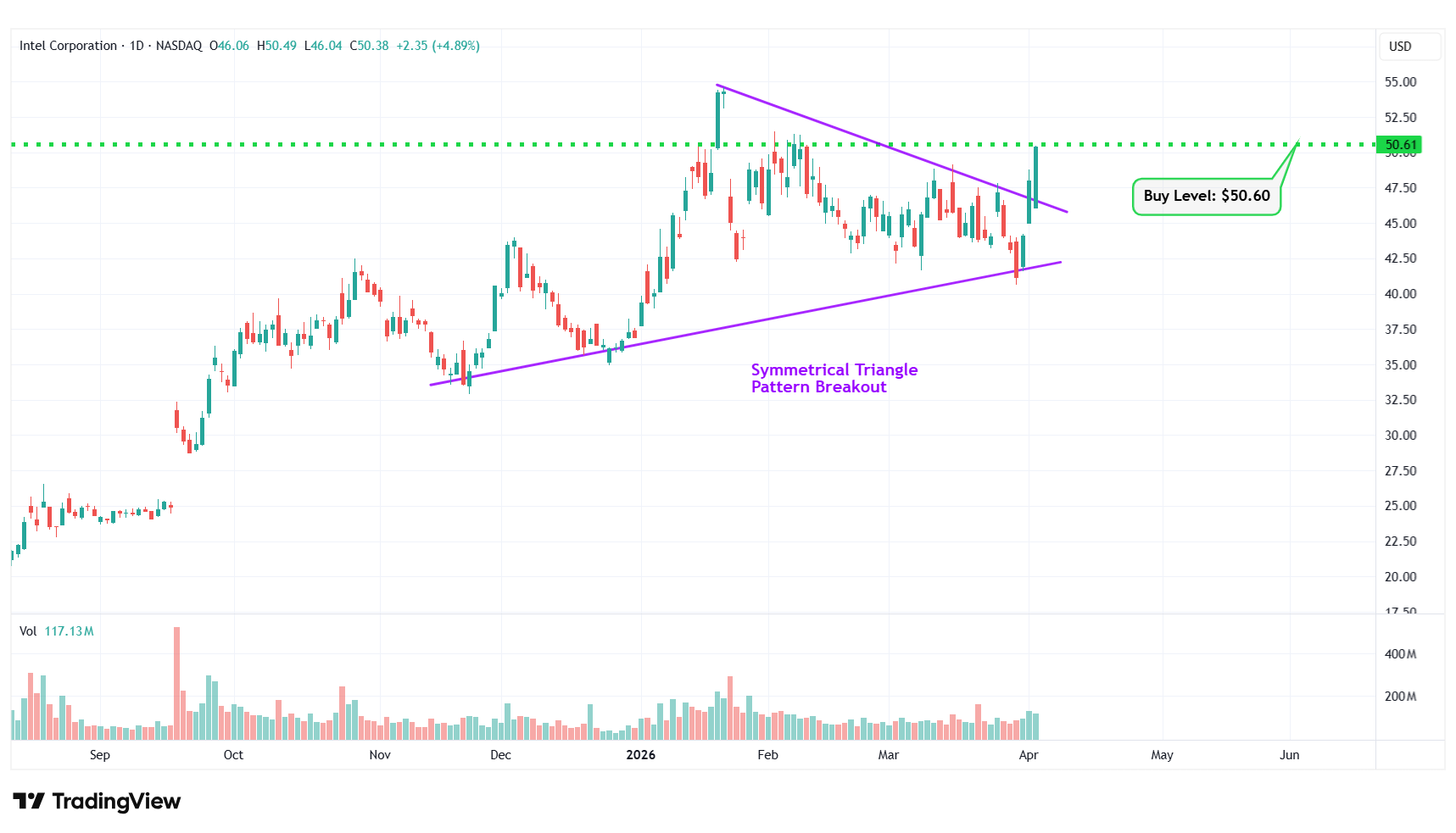 INTC – Symmetrical Triangle Pattern Breakout