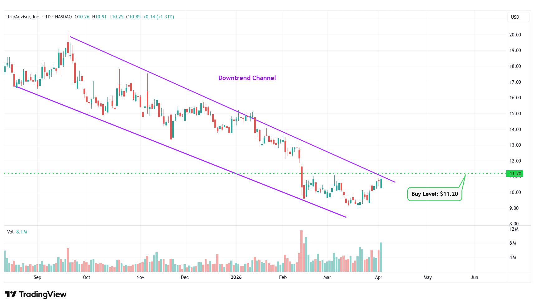 Buy Level(s): The daily chart shows that the stock is currently forming a downtrend channel. The ideal buy level for TRIP is if the stock breaks out of the downtrend channel and has a daily close above $11.20. This is marked in the chart below as a green color dotted line.
