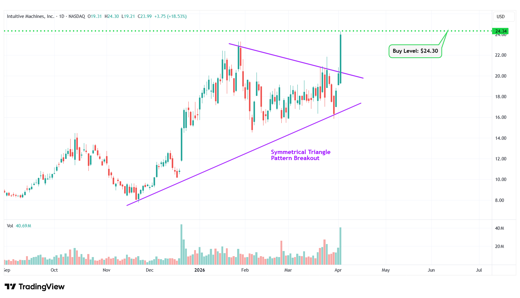 6 Intuitive Machines Inc. NASDAQ: LUNR $23.99 $24.30 Symmetrical Triangle Pattern Breakout
