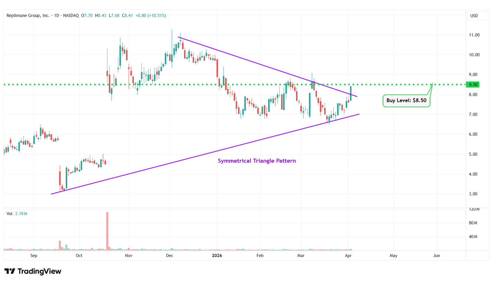 Buy Level(s): The ideal buy level for REPL is if the stock has a daily close above the breakout level of the symmetrical triangle pattern, at around $8.50. This is marked in the chart below as a green color dotted line.