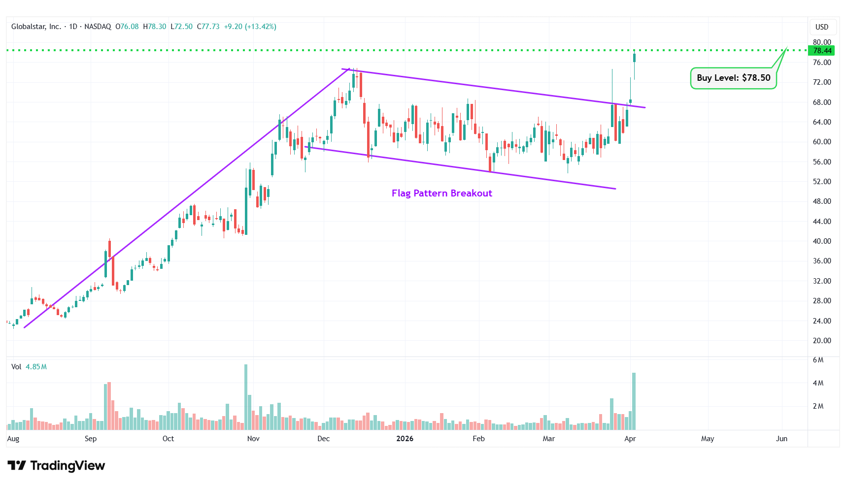 Buy Level(s): Although the stock has currently broken out of the flag pattern, the ideal buy level for GSAT is above the near-term resistance level of $78.50. This is marked in the chart below as a green color dotted line.