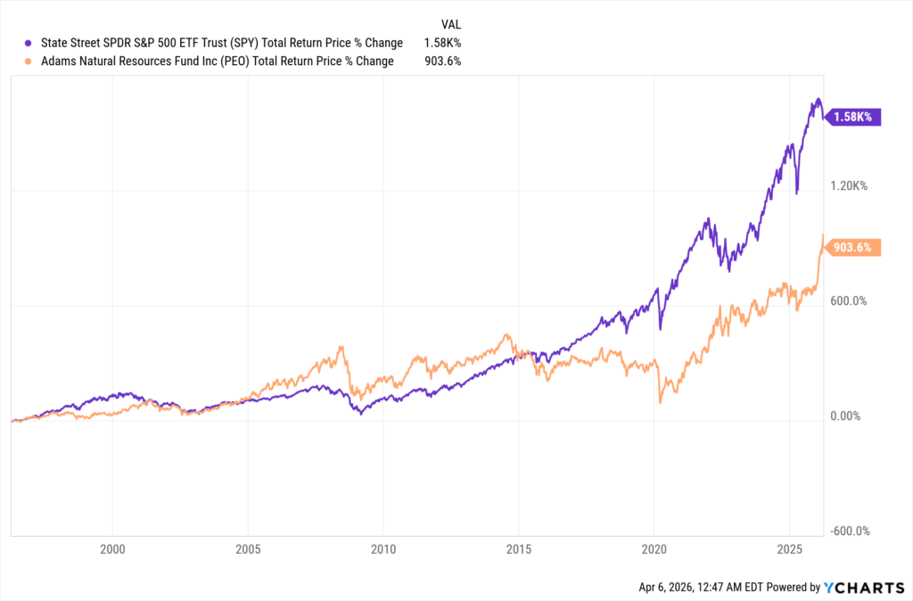 And indeed, while oil investments like PEO can outperform in the short term and do tend to rise over time, they lag the market in the long haul—with more volatility, too.