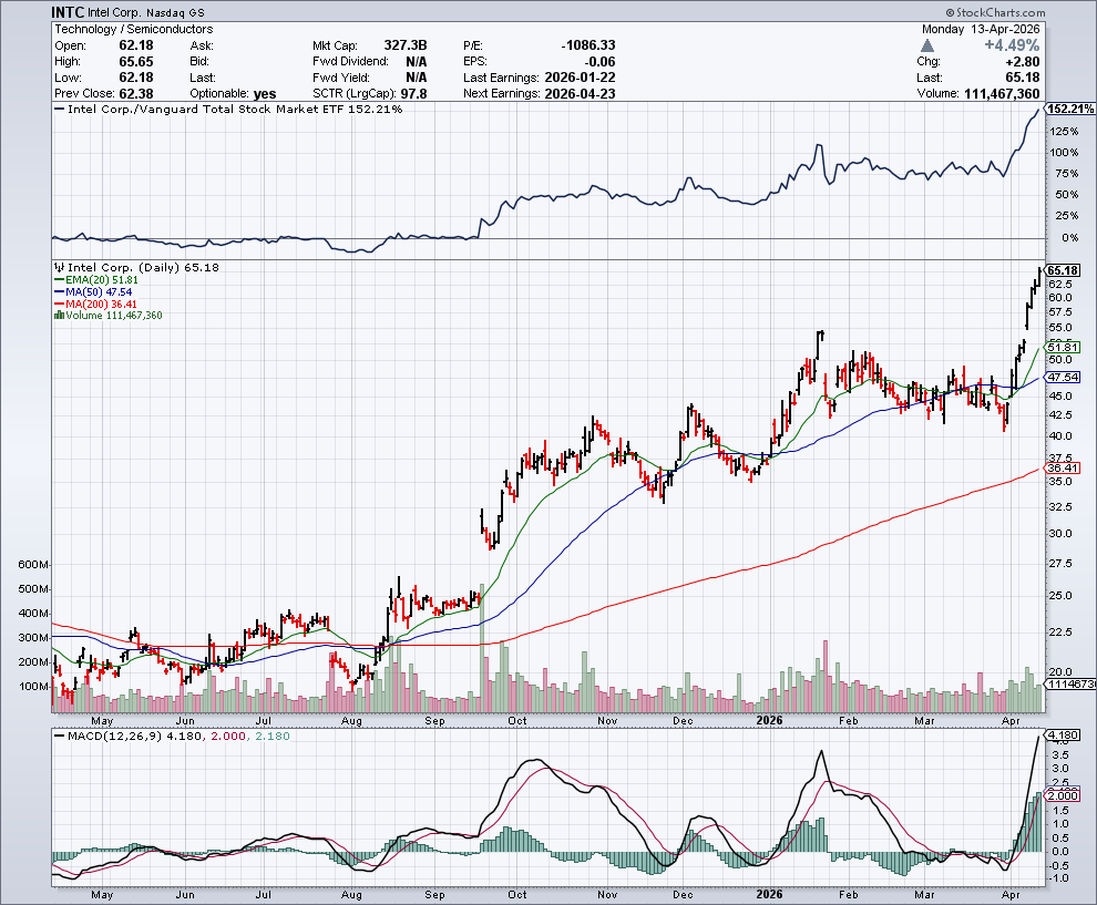 At the time, we highlighted INTC as a breakout candidate with a buy level of around $50.60. Yesterday, the stock closed at $65.18. That’s a massive move in just one week.