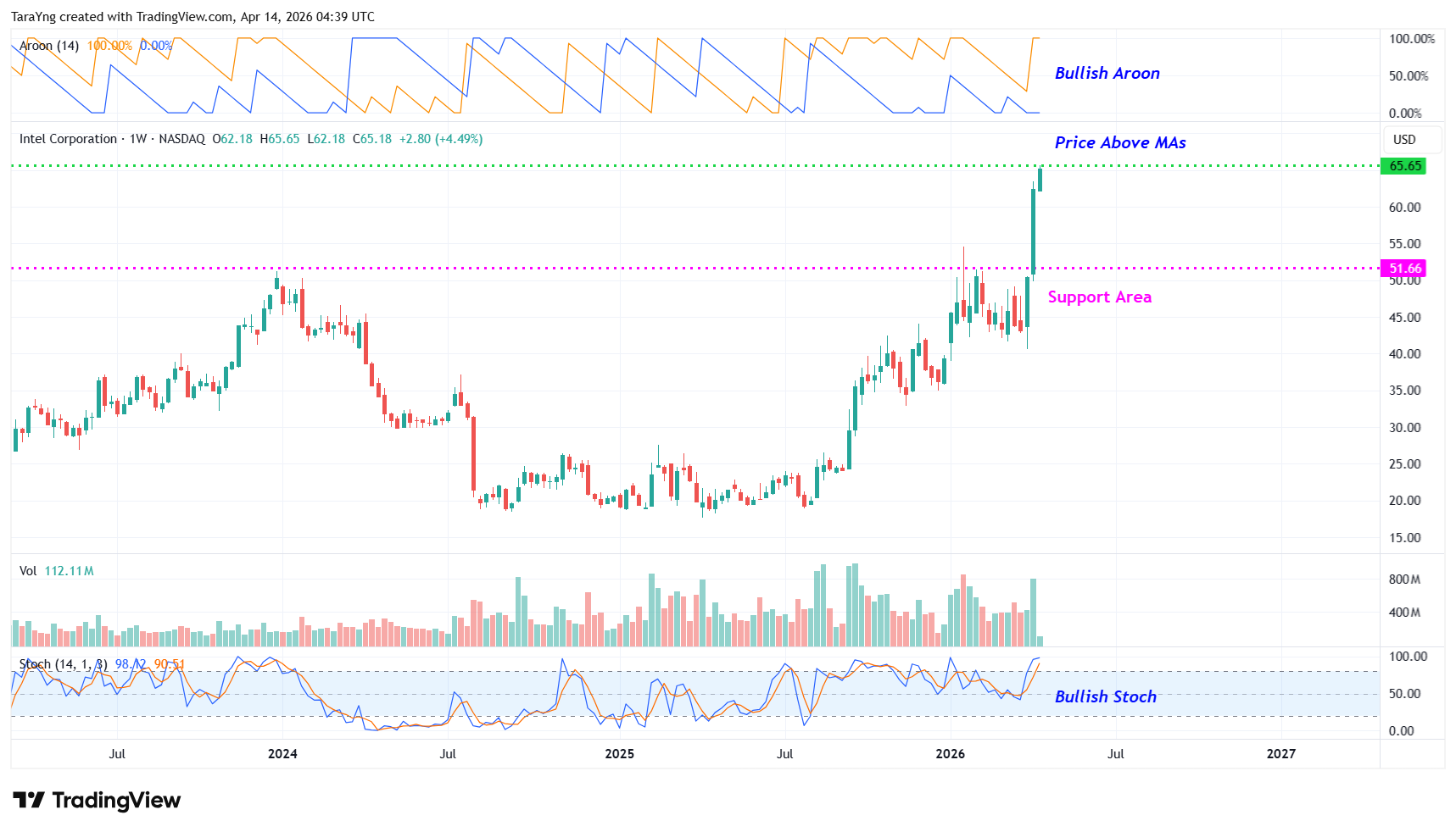 #7 Bullish Aroon: The Aroon indicator also looks bullish on the weekly chart, with Aroon Up above 70 and Aroon Down below 30.