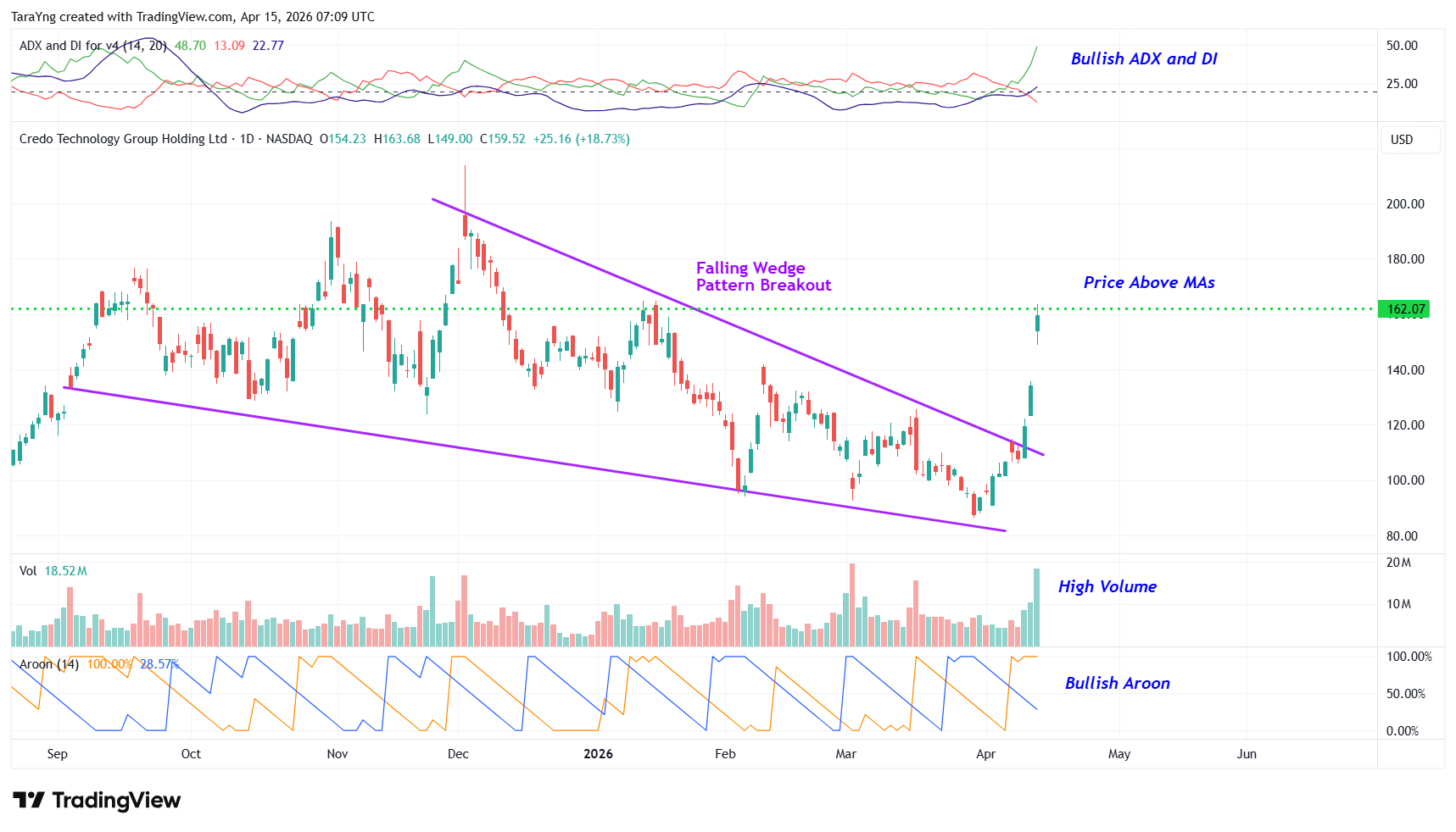The market clearly liked what it saw. After closing at $134.36 on April 13, the stock exploded higher yesterday, finishing around $159.52 after a massive gap up. And that move came on top of momentum that was already building as the broader semiconductor group caught fire.